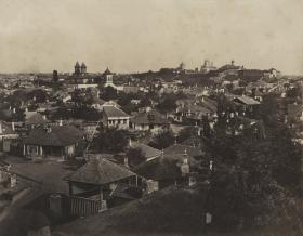 A photograph taken in 1856 by Ludwig Angerer in the “Mahalaua Antim” district of Bucharest, capturing the features of daily life and traditional architecture in the mid-19th century.