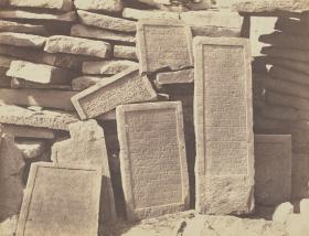 A photograph of some funerary inscriptions on stone slabs in one of the ancient tombs in Aswan, mid-19th century.