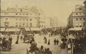A snapshot from the United Kingdom, Great Britain, showing the movement of people and transportation in the city of London, specifically on Oxford Street in the year 1880 AD