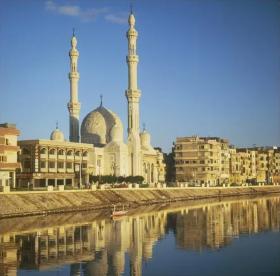 A photograph of the Al-Bahr Mosque in Damietta, apparently taken from the Damietta Bridge around 1980.