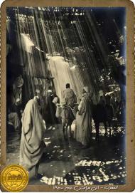 To Marrakech, Morocco, 1950 — a vibrant scene from the old city’s market, where sunlight filters through wooden roofs, casting a magical glow on the bustling passageways and capturing the timeless spirit of Marrakech.